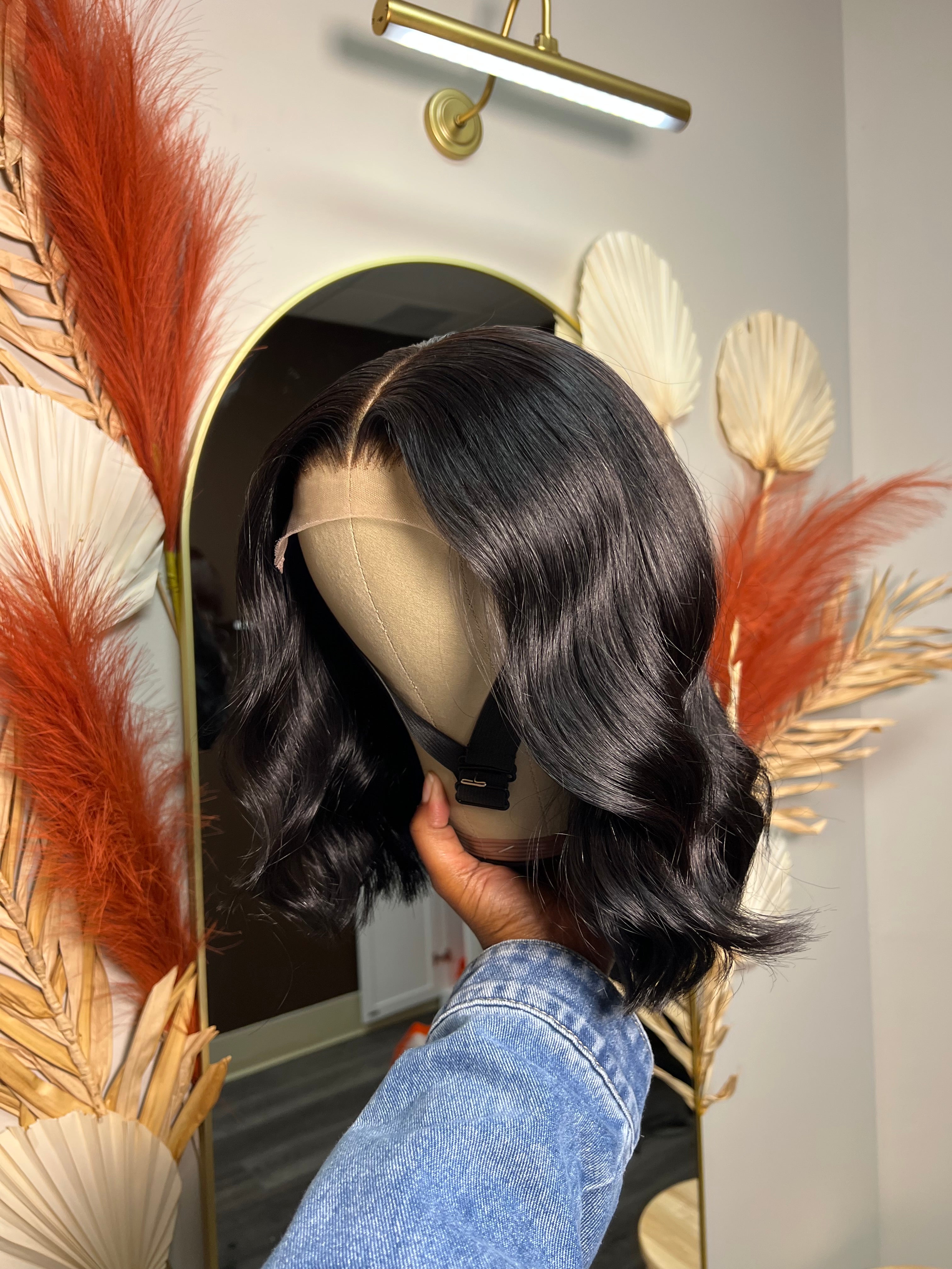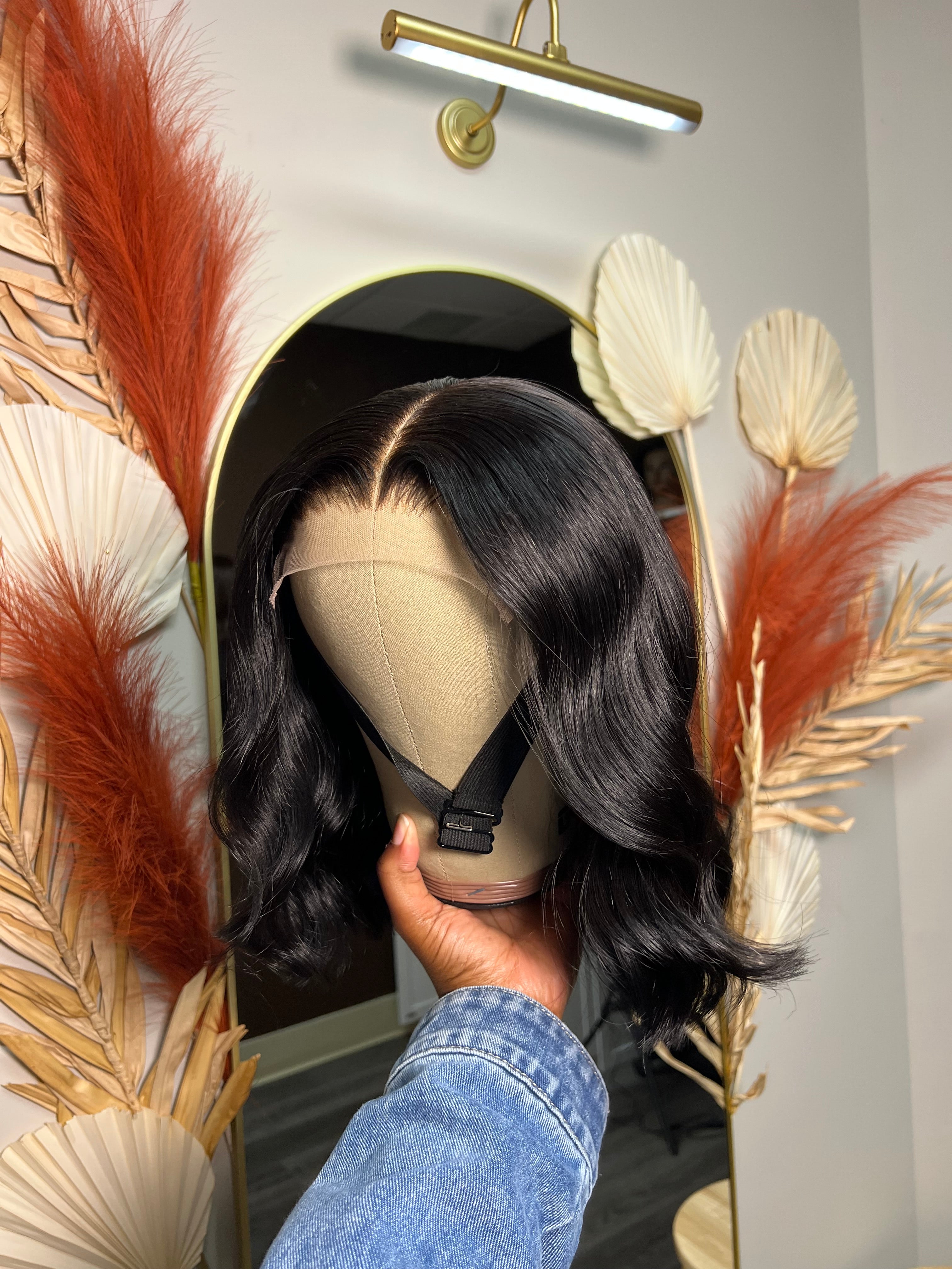 Size S (21"). 5x5 HD lace closure. (3) 18" Raw SEA Straight Extensions, blunt cut w/ soft beach waves. Dyed jet black. Custom machine made in suite. Ready to ship unit.